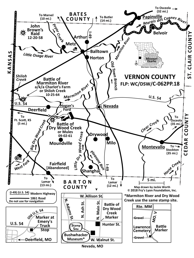 Marker Location: 38°1’24.0996”N 94°34’33.8124”W, Emery’s Truck Stop, 7490 E. 54 Hwy., Deerfield; and Lawrence Cemetery, 3½ miles north of Stotesbury, Mo.