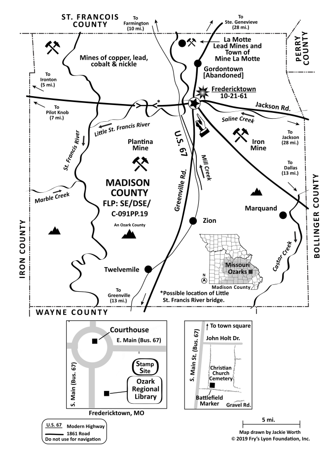 On October 21, 1861, a minor battle occurred near Fredericktown, in Madison County, southeast Missouri. Union losses were 6 killed, 60 wounded, per Colonel Plummer’s report. A rebel (MSG) report indicated 20 killed, 27 wounded. However, Colonel Plummer reported Union troops buried 158 enemy, found on the battlefield.