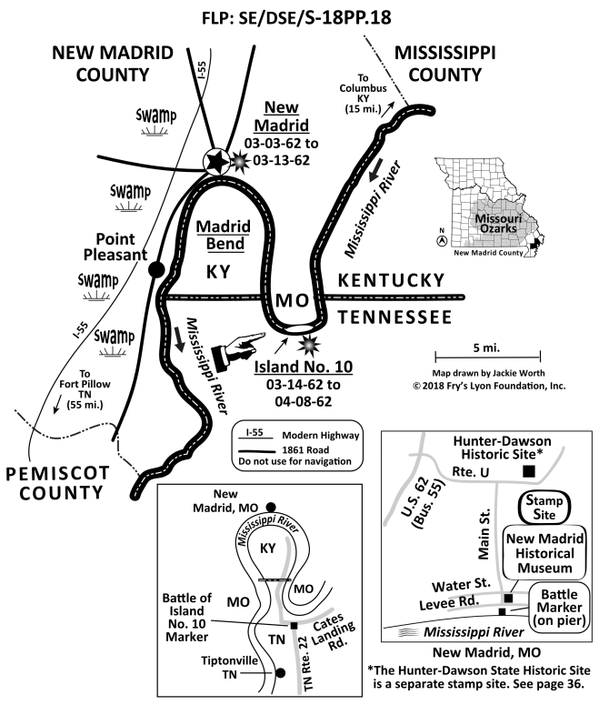 INTERIOR DEPT. SUMMARY: With the surrender of Forts Henry and Donelson, Tennessee, and the evacuation of Columbus, Kentucky, Gen. P.G.T. Beauregard, commander of the Confederate Army of the Mississippi, chose Island No. 10, about 60 river miles below Columbus, to be the strong point for defending the Mississippi River. Nearby was New Madrid, one of the weak points. Brig. Gen. John Pope, commander of the Union Army of the Mississippi, set out from Commerce, Missouri, to attack New Madrid, on February 28. The force marched overland through swamps, lugging supplies and artillery, reached the New Madrid outskirts on March 3, and laid siege to the city. Brig. Gen. John P. McCown, the garrison commander, defended both New Madrid and Island No. 10 from the fortifications. He launched a sortie, under Brig. Gen. M. Jeff Thompson, Missouri State Guard, against the besiegers and brought up heavy artillery to bombard them. On the 13th, the Confederates bombarded the Yankees to no avail. Since it did not appear possible to defend New Madrid, the Confederate gunboats and troops evacuated to Island No. 10 and Tiptonville. On the 14th, Pope’s army discovered that New Madrid was deserted and moved in to occupy it. A U.S. Navy flotilla, under the command of Flag-Officer Andrew H. Foote, arrived March 15 upstream from Island No. 10. The ironclad Carondelet on the night of April 4 passed the Island No. 10 batteries and anchored off New Madrid. Pittsburgh followed on the night of April 6. The ironclads helped to overawe the Confederate batteries and guns, enabling Pope’s men to cross the river and block the Confederate escape route. Brig. Gen. William W. Mackall, who replaced McCown, surrendered Island No. 10 on April 8. The Mississippi was now open down to Fort Pillow, Tennessee.