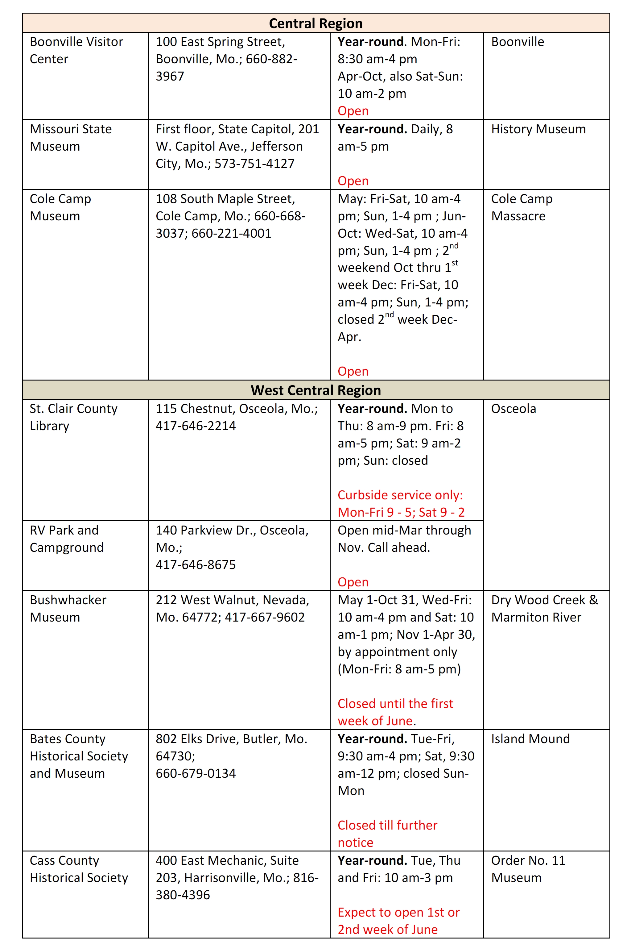 Stamp Site Locations and Hours