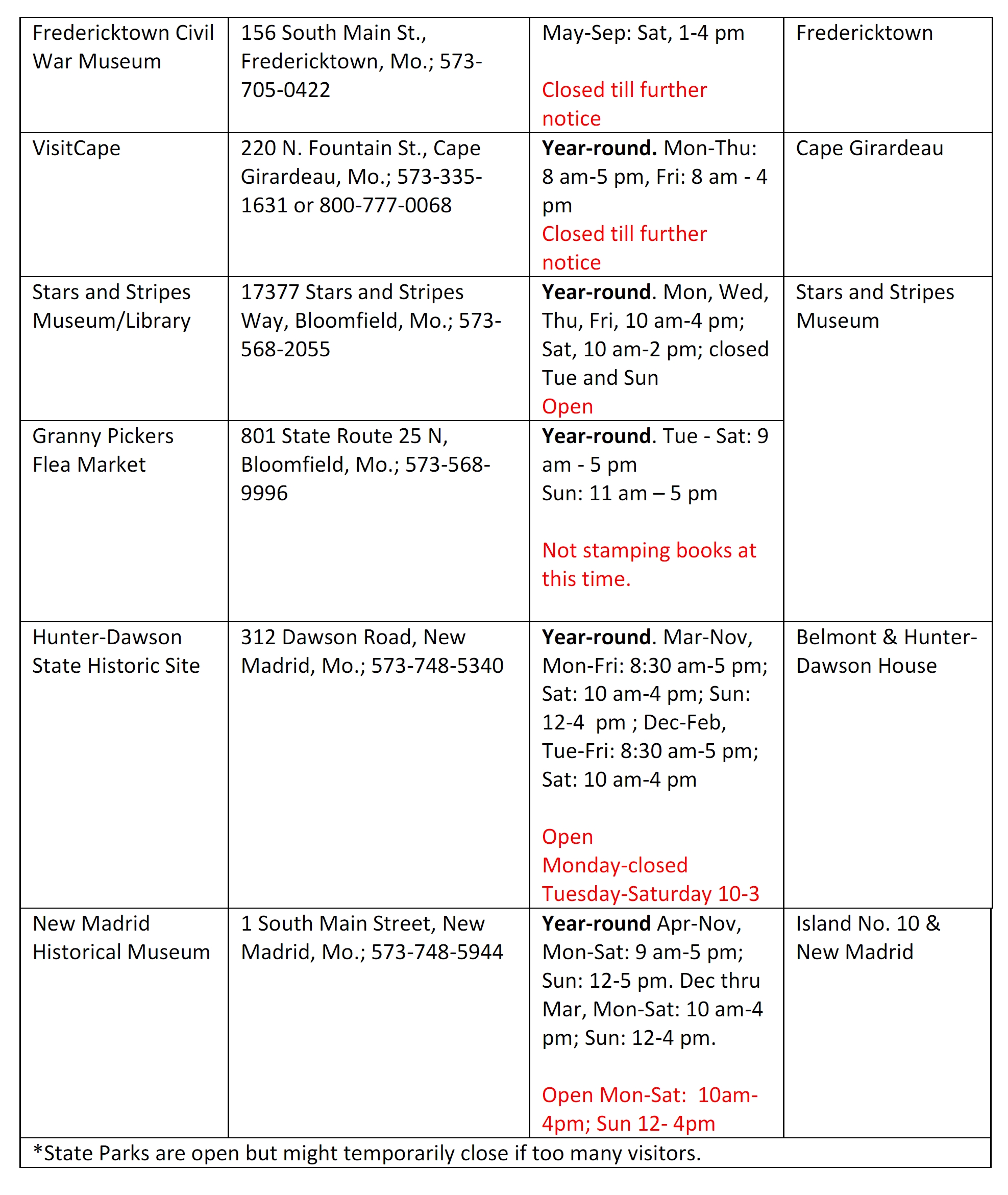 Stamp Site Locations and Hours